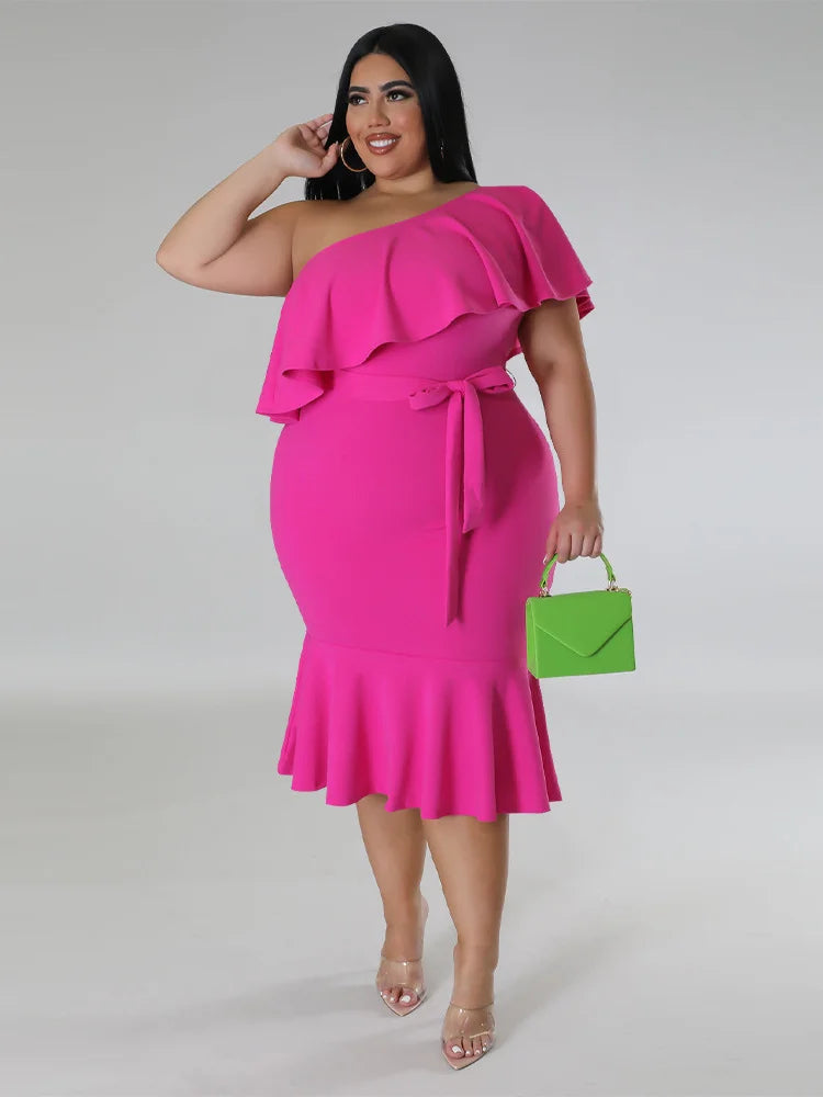 Turn heads in this stunning one-shoulder ruffle dress, designed for elegance and confidence. The figure-hugging silhouette accentuates your curves, while the layered ruffle detail adds a touch of glamour. The belted waist creates a flattering fit, and the flared hemline gives a chic, feminine finish.